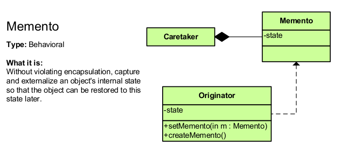 - Memento: carries state information about an Originator object,