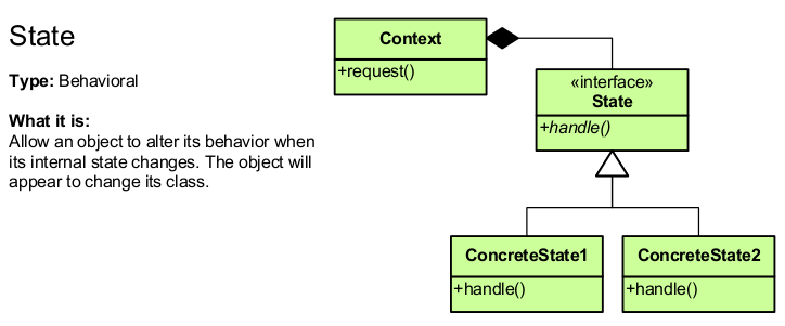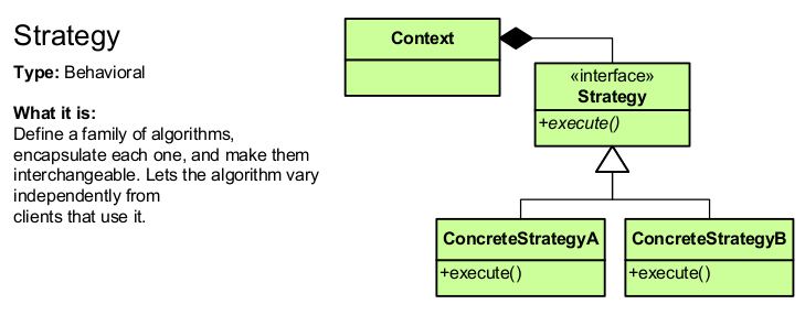 - Strategy: encapsulates an abstract behavior that has several