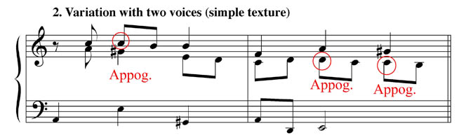 2. Next, the first variation is composed, making use of a simple, exposed texture. This variation should avoid elaborate use of non-harmonic tones to enable the progression to remain transparent. In terms of drama, the development of any variation form from the Common Practice Era (and many from the Modern Era) tend to proceed from the unassuming to the complex in waves wherein climaxes are offset by sudden drops in activity only to build to greater climaxes.