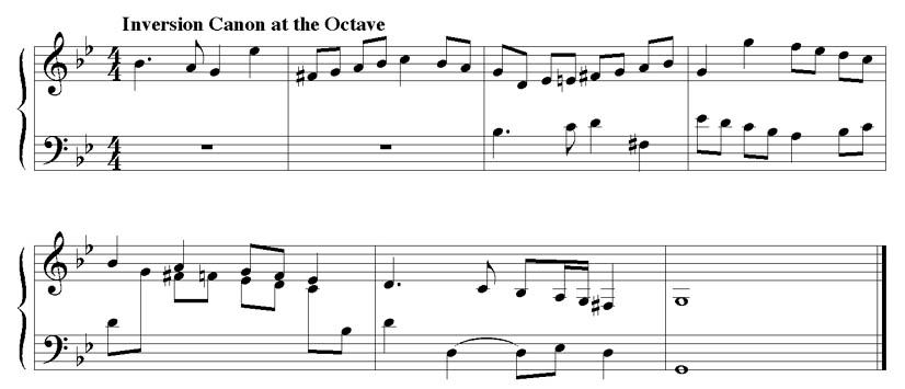 1. One of the basic manipulations of melodic material that can be implemented in order to achieve a new and distinct contour is the inversion. As we have seen before, it is sometimes necessary to make chromatic and other minor alterations in order for the new line to conform to the tonal space it has been accorded. However, as with the previous canons, the approach to its composition is not all that different. In step one, we have provided the two bar introduction of the dux material (treble voice) followed by its inversion in the comes (bass voice).
