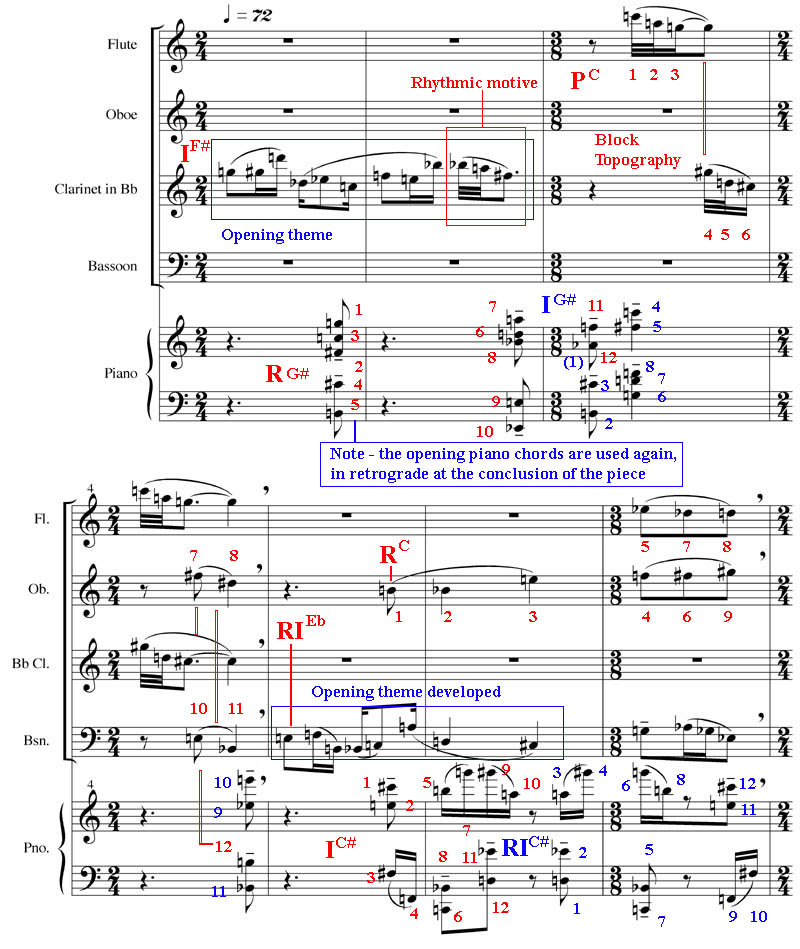 Regarding how faithful we remain to the series precise, once again, we find occasions when there needs to be some degree of flexibility for our expressive requirements: in bar 4, the 9th note of the row that is being shared by the winds is skipped, while the final pitch in the piano is eliminated. The composition student must learn to always trust his/her musical instinct even if the system of choice prescribes something else.