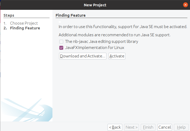 Note the message about activating JavaFX